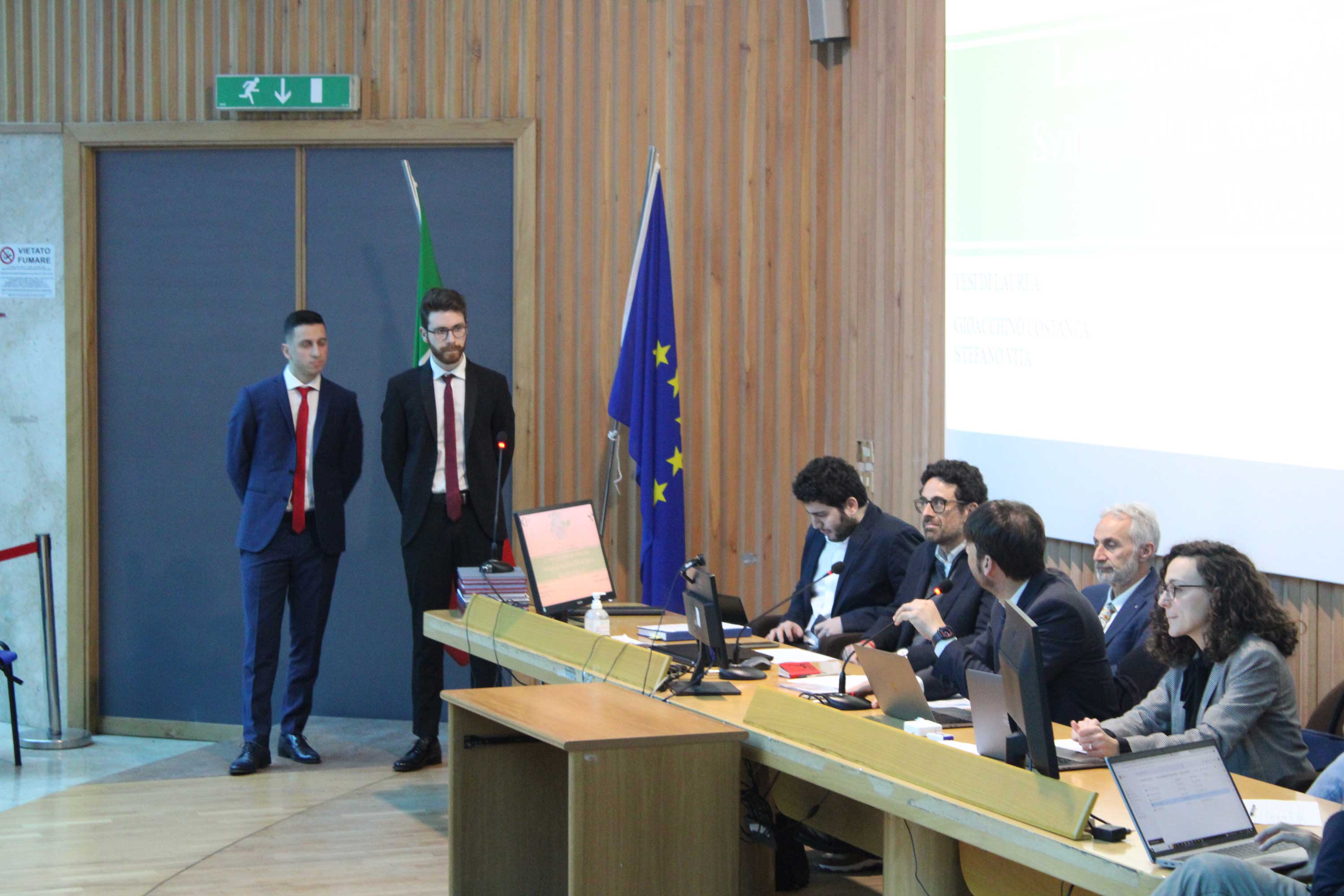 À la fin de toutes les discussions, les professeurs se retirèrent pour décider des votes et peu de temps après ils revinrent pour commencer les proclamations, acte par lequel Stefano et Gioacchino devinrent officiellement docteurs en ingénierie de gestion.
